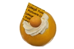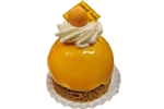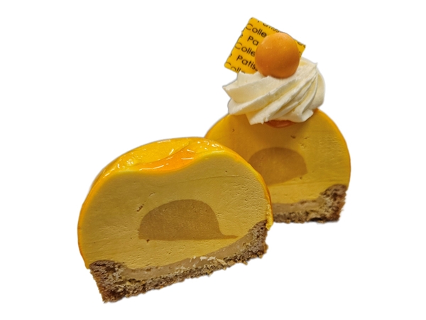 Yoghurt Mangobavaroise op een sloffenbodem met een vulling van passiecremeux
