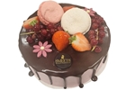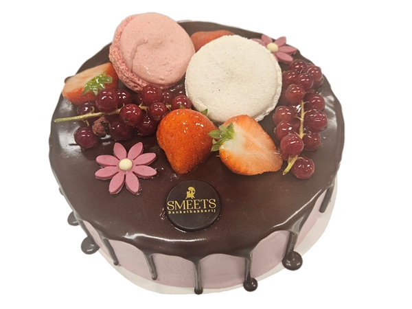 Laagjescake met Zwitserse room, mandarijntjes, stukjes bitterkoek, Marasquin.met daaroverheen een chocoladespiegel en fruit