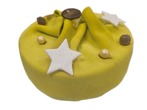 kersttaartje van een crumblebodem met pistachechocolademousse en een verrasing van kersen, in marsepein gewikkeld