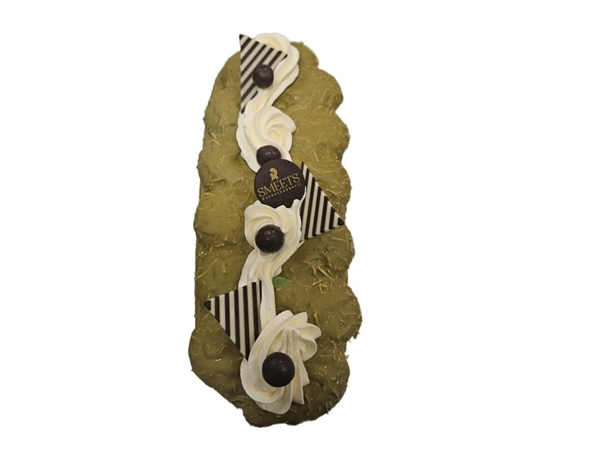 Sloffenbodem met pistache bavaroise, chocoladecanache, witte chocolade en kunefe